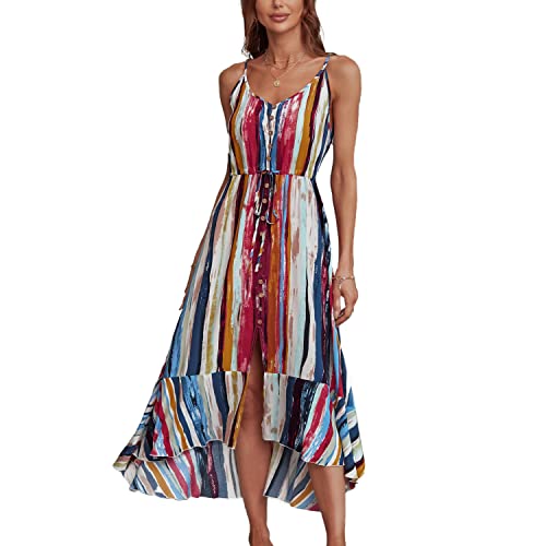 BROVAVE Dam 2024 sommar casual boho solklänning polkaprickig spagettirem v-ringad blommiga midi-klänningar, 008 Färgblock, L