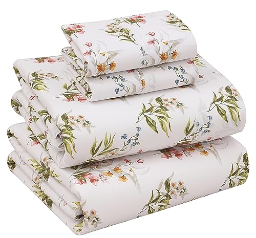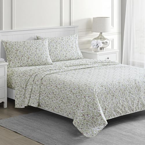 Martha Stewart Rachel Jacobean blommig 300 TC 100% bomull perkal lakanset, grön/lila, 4 delar – 1 lakan, 1 dra-på-lakan, 2 st örngott, andningsbara bomullstryckta lakan, queen size