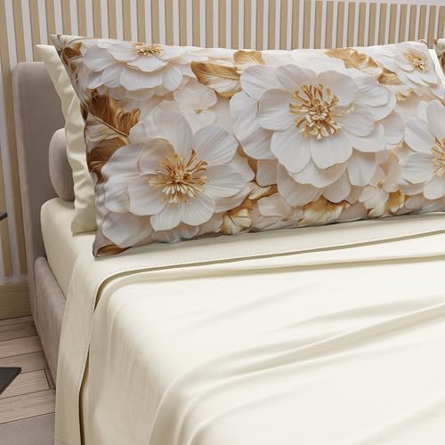 KOMFOR 4-delat lakan set drottning blommiga löv hotell lyxigt lakan – 1 platt lakan 1 formsytt lakan 2 örngott dubbel borstad mikrofiber allergivänligt djupt dra-på-lakan set beige