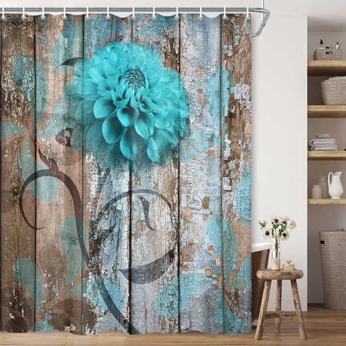 JAWO bondgårdsblomma blommigt duschdraperi, rustik blågrön turkos dahlia duschdraperi set, lantlig blå vild trädgård växt tyg duschdraperi med krokar, surrealistisk badrumsgardin, 175 x 178 cm