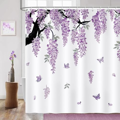 COZZSNUGE Lila blommigt duschdraperi, blåregn blomma fjäril badrumsdraperi 183 x 183 cm, vattenavvisande mögelbeständig polyester med 12 krokar