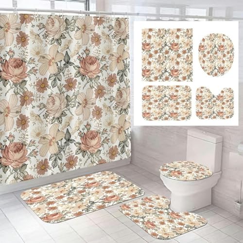 1/4 st vintage blommigt tryckt duschdraperi set, vattentätt duschdraperi, halkfri matta, toalettlock matta och U-form matta – fyrdelat duschdraperi set
