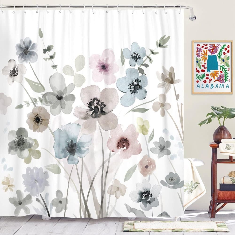 WITHLOC Duschgardin utan krok med tryckfäste – akvarell blommigt duschdraperi – tyg vattentätt innerfoder, växter blå beige blommor vit duk duschdraperier tvättbar, 180 x 183 cm