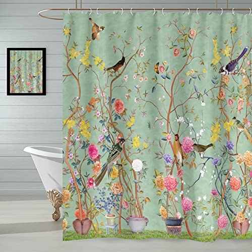 Hnayet Blommigt duschdraperi, vattentäta badrumsdraperier med fågel, blomma, mögelbeständigt draperi för våtrum och dusch, tvättbart badkarsdraperi med 12 krokar (grönt, 180 x 180 cm (71 x 71 tum)