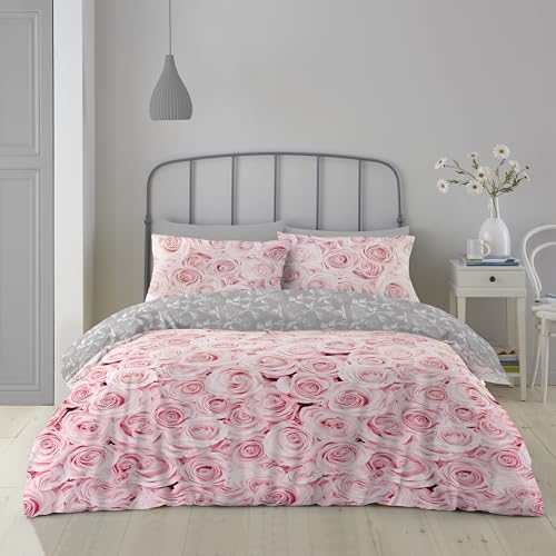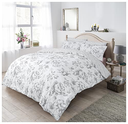 Dreamscene engelsk ros påslakan med örngott vändbart blommigt bäddset DDHSEROGR02, grå rodnad vit, 3 delar, dubbel