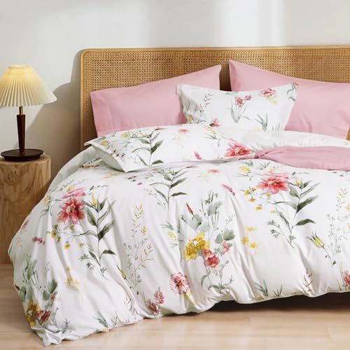 AMWAN Rosa blommigt påslakan dubbel XL bomull trädgårdssängkläder set barn flickor vitt täcke estetisk botanisk vintage blomtryck med dragkedja
