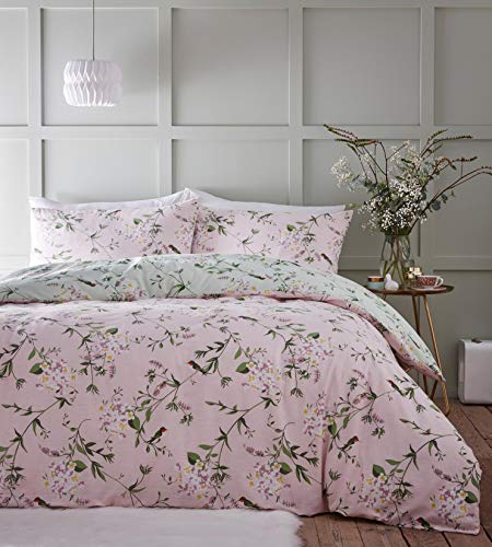 Dreams & Drapes – rosa blommigt och fågel påslakan – Super King sängkläder storlek (260 x 220 cm) – vändbart (2 mönster) – 3 delar – vintage blommiga sängkläder i rosa – vårträdgård blomma påslakan