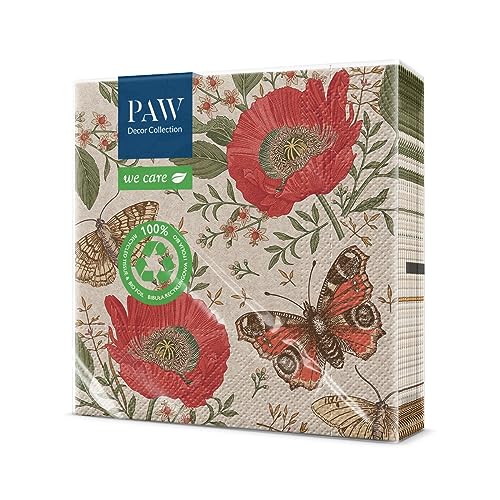 PAW – servetter 3-lager (33 x 33 cm) I 20 stycken I perfekt för födelsedagar, fester, nattvard och fester I pappersservetter med naturmotiv I miljöskydd, blommor, fjärilar I passing fjärilar