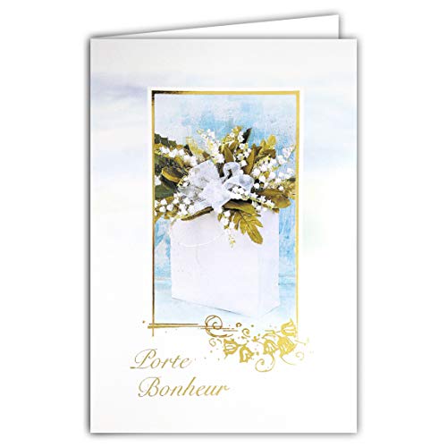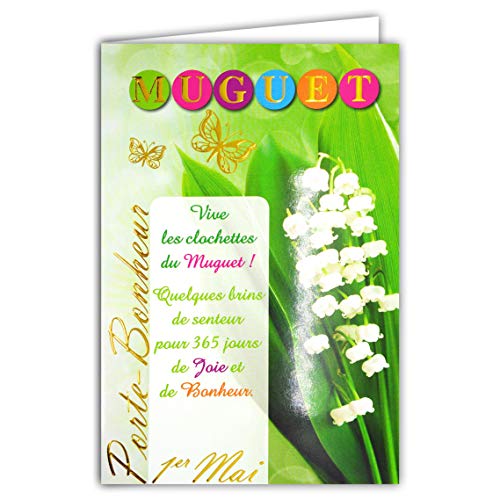 Afie 68-1047-B kort med gult kuvert muguet-bonhEUR 1 maj guld glänsande bukett 13 vita klockor blommor fjärilar fest våren