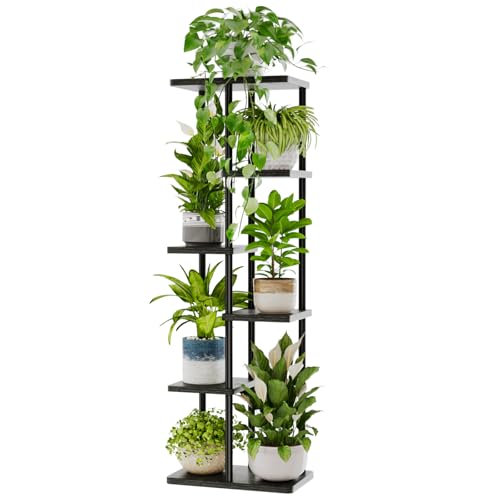 Bamworld Högt Metall och Trä Blomsterställ Växtställ med 6 Nivåer Växthylla för Inomhus Blomstrappor Modern Blomsterhylla för Vardagsrum Balkong Svart