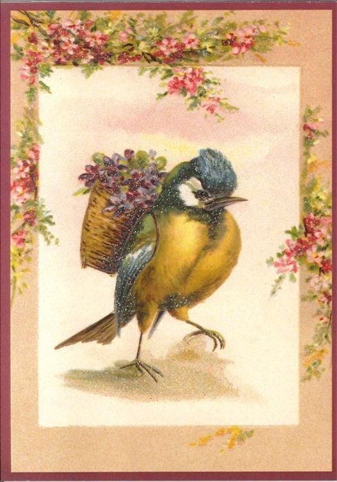 Enkelt kort med glitter - Fågel med blomsterkorg (Fraktfritt)