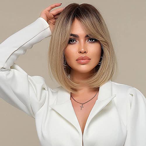 Esmee Kort Ndulé blond Bob-peruk med lugg, 36 cm, naturlig, syntetisk, värmebeständig, för kvinnor, med mörka rötter, för fest, vardag, cosplay