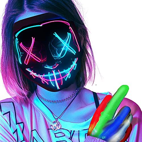 Halloween-mask med LED-handskar, halloweenkostymer för män och kvinnor – skrämmande LED-rensningsmask, skelett, LED-glödhandskar, kostymer, lyser upp anonym skrikmask för barn, vuxna, halloweengåvor