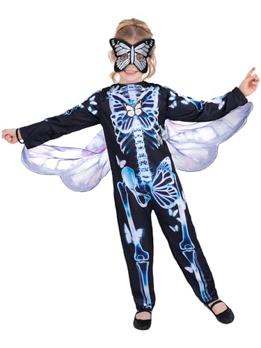 Smiffys fjärilskelettdräkt allt-i-ett, vingar och mask, halloween barn maskeradklänning, skelett utklädningsdräkter