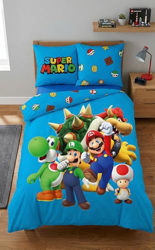 Blå Super Mario sängkläder 135 x 200 cm + 80 x 80 cm - med Mario, Luigi, Toad, Peach, Wario och Yoshi - påslakan och örngott - tysk storlek