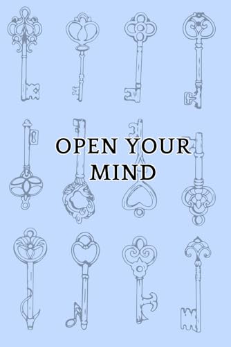 Open Your Mind: A blue, blank, lined page notebook decorated with keys and a quote