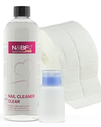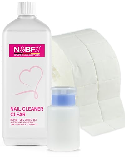 N&BF Nagelrengörarset 1 000 ml + dispenser, pumpflaska + 1 000 cellulosa kuddar (2 rullar med 500 stycken) – 70 % isopropanol alkohol isopropyl alkohol 1 L – för gelnaglar – nagelrengörare (blå 150)