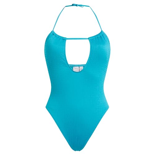 SHEKINI Women's Metallic Shiny Bathing Suit Scoop Neck Backless One Piece Swimsuits(Blue, Small)