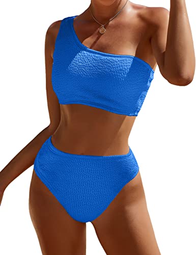Pfreesea Bikini Sets for Women High Waisted 2 Piece Bestselling Swimsuit Ribbed One Shoulder Tummy Control Bathing Suit 2025 Blue