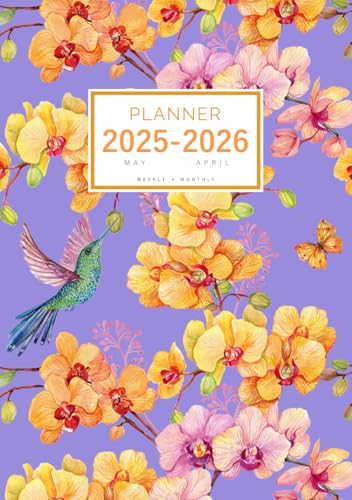 Planner May 2025-2026 April: A5 Small Weekly and Monthly Organizer | Hummingbird and Orchid Flower Design Blue-Violet