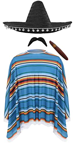 Mexikansk mankostym – blå, grön och orange poncho, svart sombrero, mexikansk tash, falsk cigarr – vuxna Western Bandit Wild West Cinco de Mayo maskeraddräkt