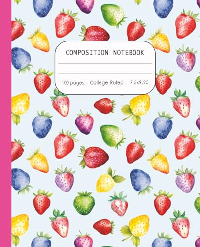 Composition Notebook Wide Ruled: Cute Strawberry Design in Red, Pink, Yellow, Green and Blue. Back to School Supplies for Girls, Kids, Teens.