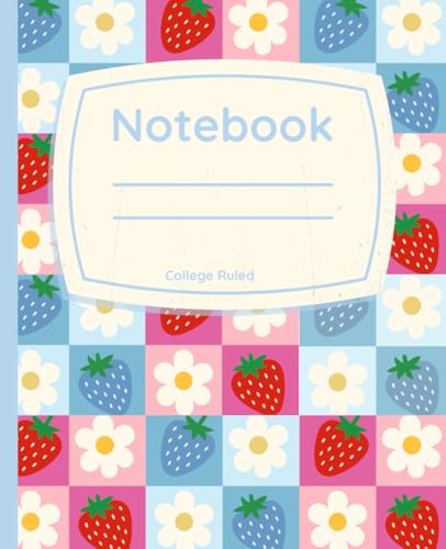 Blue Pink Strawberry Flower Checkered Notebook: College Ruled Composition Book, 110 Pages