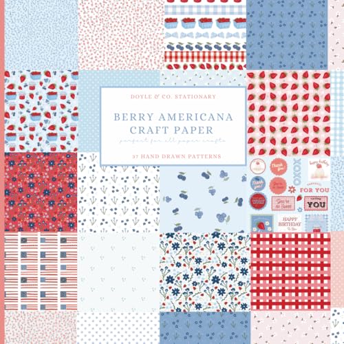 Berry Americana Craft Paper Book – 8.5” x 8.5” – 75 Pages, 37 Hand-Drawn Designs – Pink, Blue & Red Strawberry & Blueberry Theme – Florals, Polka ... Colors – Scrapbooking, Cardmaking, Crafts