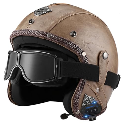 Motorcykel Öppen Bluetooth-hjälm Retro Jet Motorcykel Läderhjälm Med Modeglasögon Vuxen Halvhjälm ECE-godkänd Herr- Och Damhjälmar 3/4-tums Moped Scooter(G,XL=(61~62cm))