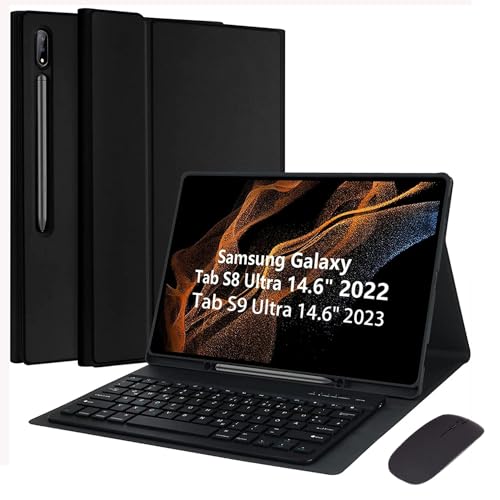 EHLCYS Keyboard Case for Samsung Galaxy Tab S9 Ultra 2023/S8 Ultra 2022 14,6 Tums Surfplatta, Magnetiskt Löstagbart Trådlöst Bluetooth Tangentbord, Ultratunt PU Läderfodral Med S Pen Hållare