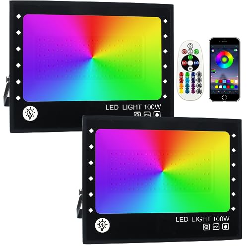 RGB LED Floodlight, OUSIDE 100W Outdoor Colour Changing Flood Lights, IP66 Vattentät Bluetooth App Control 16 miljoner färger med Timing Function för trädgård, terrass, Halloween(2 Packs)