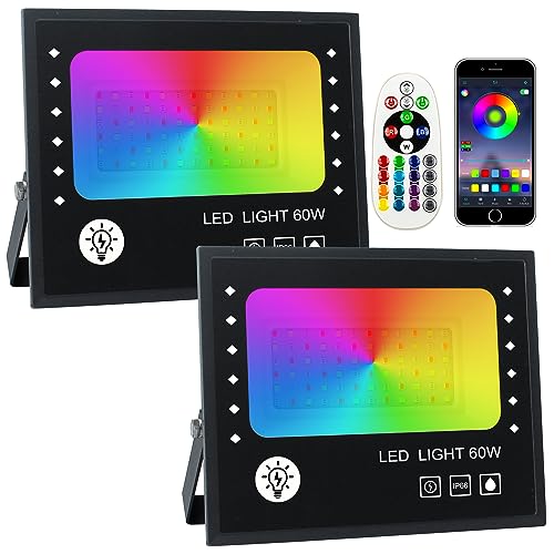 RGB LED Floodlight, OUSIDE 60W Outdoor Colour Changing Flood Lights, IP66 Vattentät Bluetooth App Control 16 miljoner färger med Timing Function för trädgård, terrass, Halloween(2 Packs)