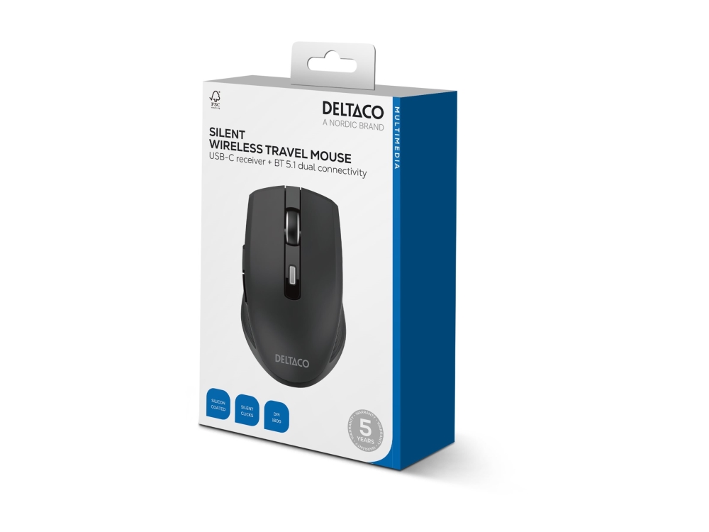 Deltaco Ms-813 - Mus - Tyst - 6 Knappar - Trådlös - Bluetooth 5.1, 2.4 Ghz - Usb-C Trådlös Mottagare - Svart - Hängande Låda