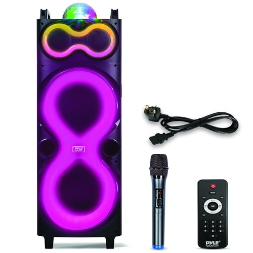 Pyle Bluetooth Speaker System with Wireless Mic, 240W PA and Karaoke Machine, Dual 10" Inch Speakers, Rechargeable Battery, USB/SD/AUX/FM Radio, LED Lights, Outdoor/Indoor Party Audio