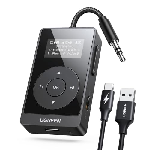 UGREEN aptX AD-HQ Bluetooth-sändare Jack Bluetooth-adapter med LED-indikator för två Airpods, sändarmottagare kompatibel med TV, flygplan, bil, 32 timmars batteritid