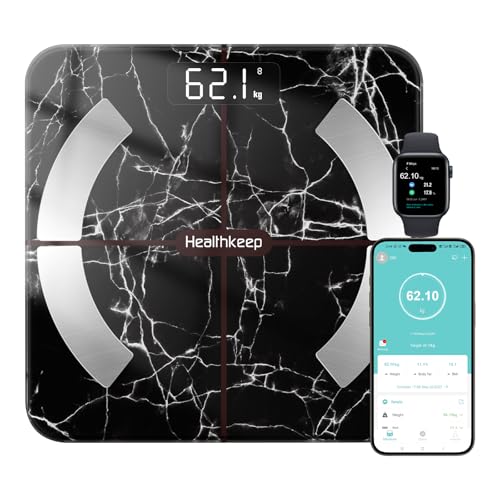Healthkeep Personvåg, Bluetooth-ansluten våg, impedansmätare, hög precision, med 13 kroppssammansättning, app ingår, kapacitet 180 kg/400 kg, 28 x 28 cm