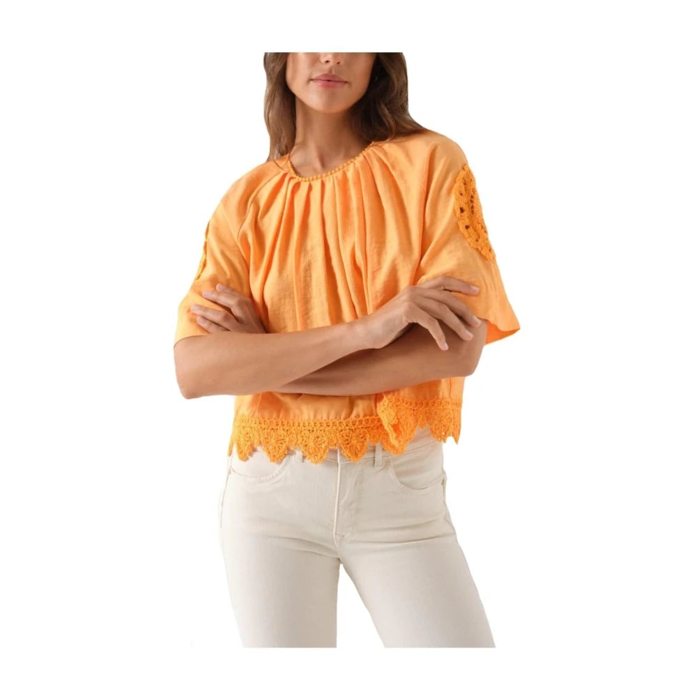 Salsa, Blusar & Skjortor , Dam, M, Orange Broderad Blus med Kort Ärm