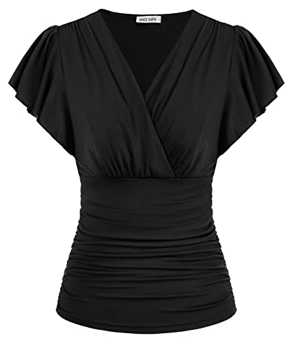 GRACE KARIN Damvolang, blus, v-ringad, kortärmade toppar, elegant veckad topp, slim fit, omlottblus, Svart kort ärm, M