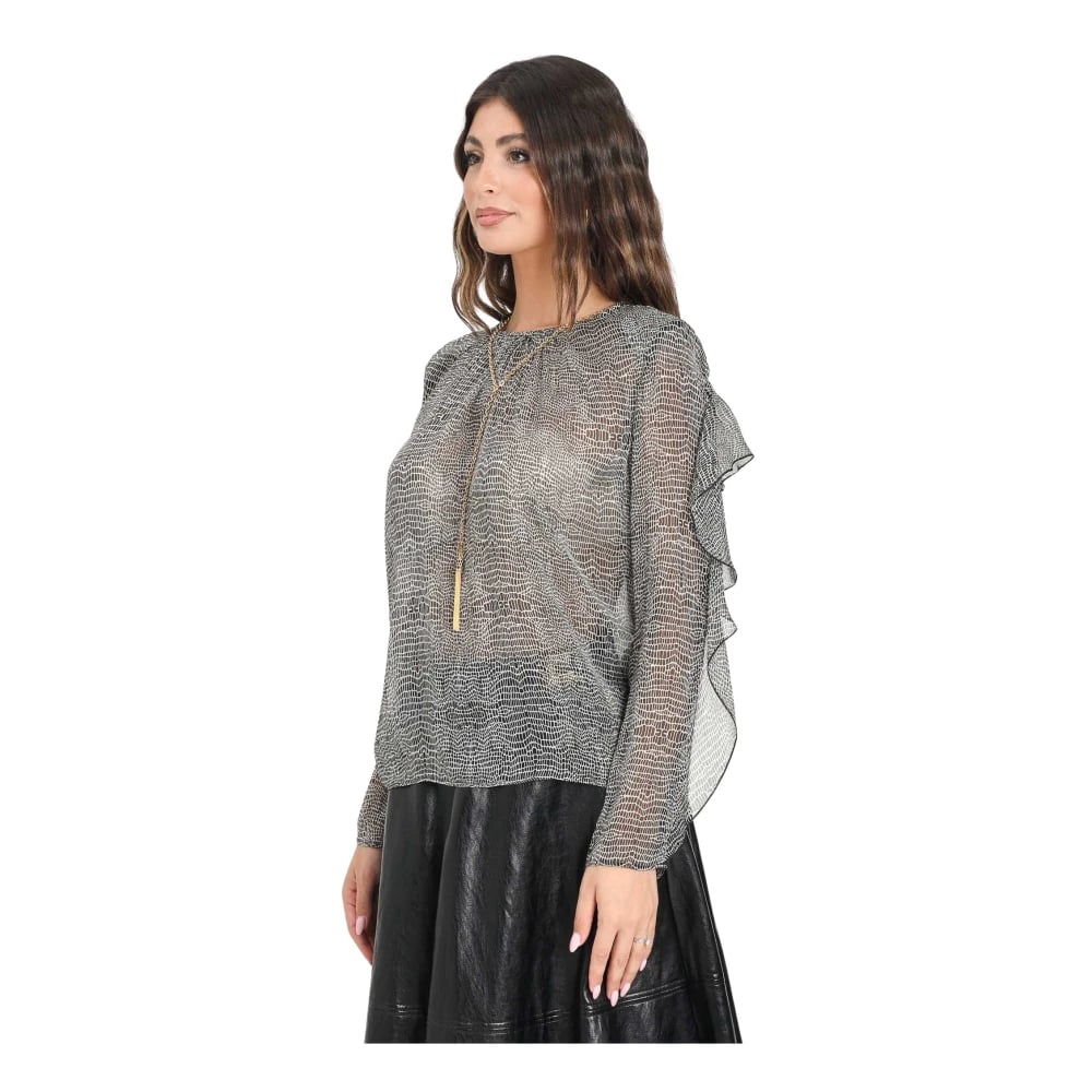 Elisabetta Franchi, Blusar & Skjortor , Dam, S, Läder, Svart Python Print Volang Blus