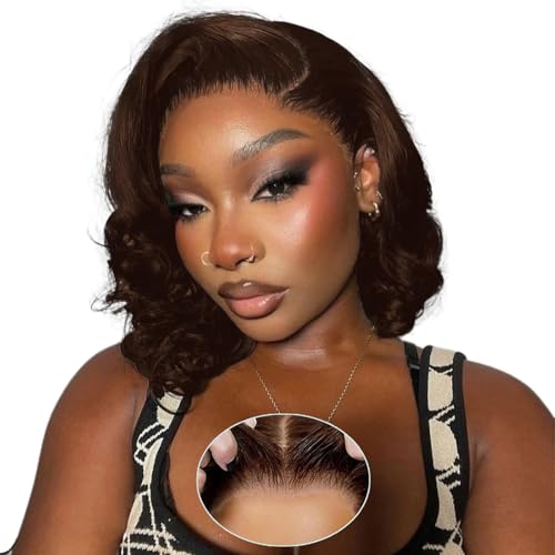 Glueless Wig Human Hair Bob Wigs for Women Human Hair Wear and Go Glueless Wig 4x4 Pre Cut Body Wave Lace Front Wigs Natural Hairline Wigs 180% Density Chocolate Brown Color 10 inch (25cm)