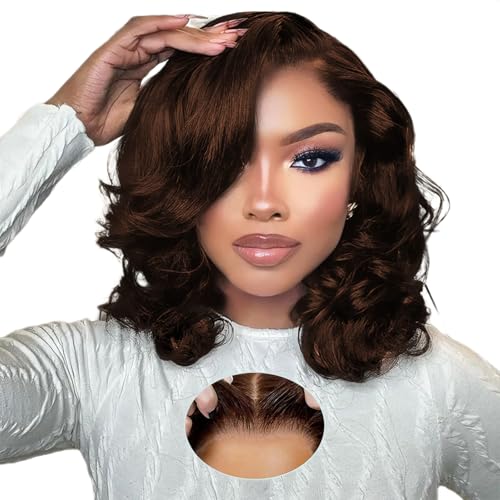 Glueless Wig Human Hair Bob Wigs for Women Human Hair Wear and Go Glueless Wig 4x4 Pre Cut Body Wave Lace Front Wigs Natural Hairline Wigs 180% Density Chocolate Brown Color 12 inch (30cm)