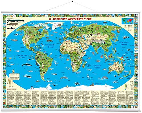 Illustrierte Weltkarte Tiere zum Aufhängen: mit Metall-Beleistung: Erlebniskarte mit Metall-Beleistung
