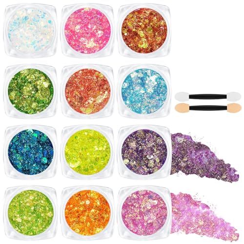 AOOWU Face Body Glitter - 12 färger makeup paljetter set - för ansikte, fluorescerande paljetter för ansikte, kropp, hår, halloween, fest, jul, #02
