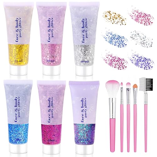 AYBUY Body Glitter gel, 6 st festival glitter ansikte, Sequins Chunky Glitter flytande gel 18 g, sjöjungfru paljetter gnistrande kosmetika festival (blå + rosa + silver + vit + guld + rosenröd)