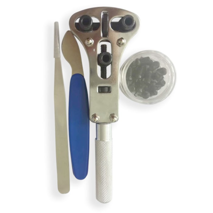 Boettöppnare med nyckel, boettöppnare armbandsur, professionell husöppnare för nycklar, med 18 skruvar, för klockreparation, för att ta bort klockans bakvägg (silver)