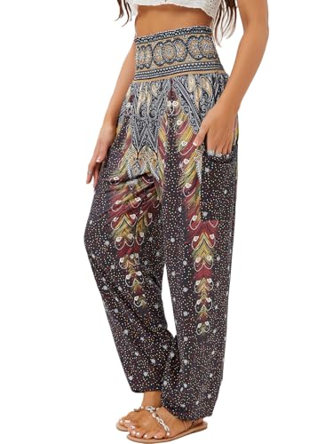 Irevial Haremsbyxor för kvinnor, hippie-byxor, bomull, strandbyxor, yogabyxor, pilates, sommarbyxor, boho, fritidsbyxor, pumpbyxor, påfågeltryck, Svart cashew