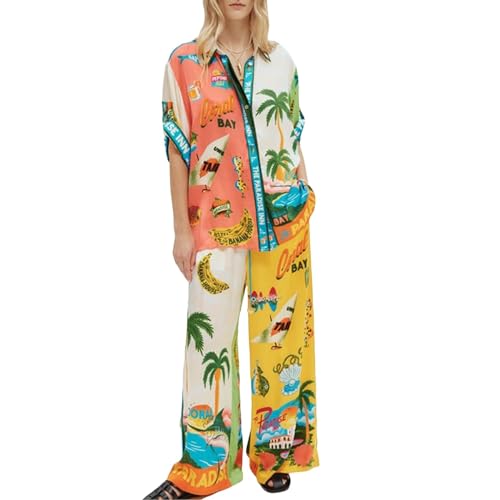 CheJooe Dam Boho-tryck 2-delat kläder casual byxor set sommar kortärmad button-down skjorta breda ben byxor semester matchande lounge set, gUL, S