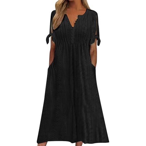 CheJooe Dam sommar boho-klänningar vintage volang ärm v-ringad tunika klänning avslappnad gunga enfärgad strand midi-klänning med fickor, Svart, XXL
