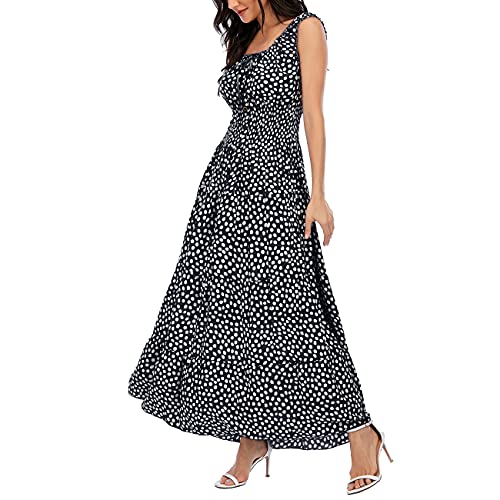 Women Dresses Summer Boho Dress Spaghetti Strap Sleeveless Tiered A Line Ruffle Hem Maxi Long Dress with Pockets Black White Floral M