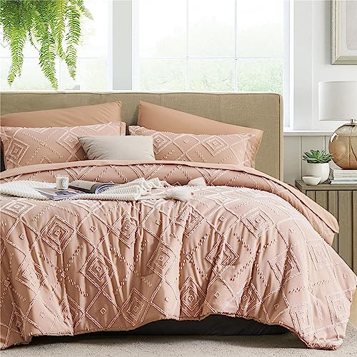 KAKKI Blush tuftad queen täcke set 7 delar säng i en väska, shabby chic boho jacquardtäcke och lakan, mjukt mikrofiber komplett bäddset för alla årstider (rosa, drottning)